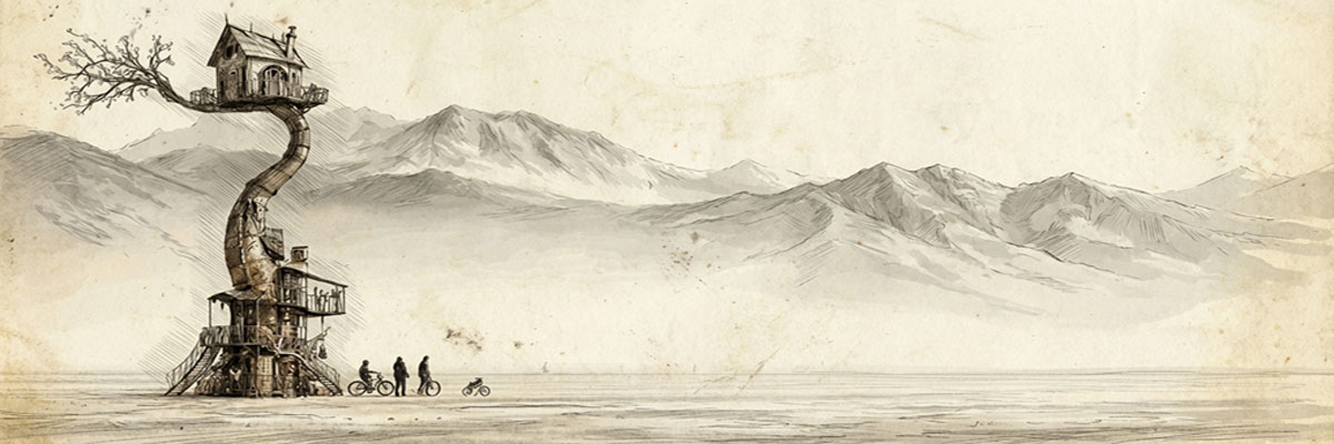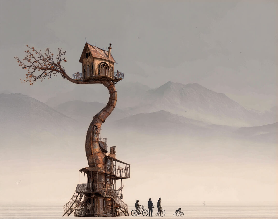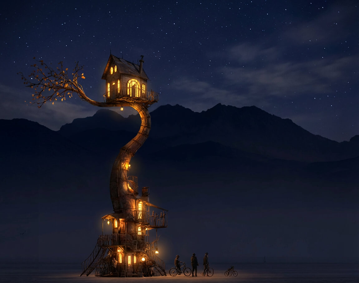 At the base of the installation is a furnished, dreamlike home filled with objects, stories, and mysteries. Rooms are layered with artifacts, maps, photographs, and fragments of narrative, clues waiting to be noticed and stories waiting to be assembled. From there, a climb upward leads to a hidden space in the sky: a glowing Victorian cottage suspended 40 feet above the playa. Inside, find a place to pause, gather, and look outward across the desert and into the stars.