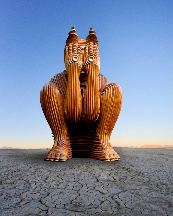 Black Rock City is full of odd creatures, and they’re well represented in the art as well! A kinetic and adorable half cat/half mermaid tells the ecological story of kelp forests, and is appropriately named “Purrmaid.” The not-quite-human figure “Behind Closed Eyes” invites you to feel the topographic surface textures shaped by the hand tools of Balinese and Javanese craftspeople. “Resilience” is a fire sculpture of a tardigrade, a microscopic water bear, one of the most indestructible organisms on Earth, capable of surviving in the vacuum of space.