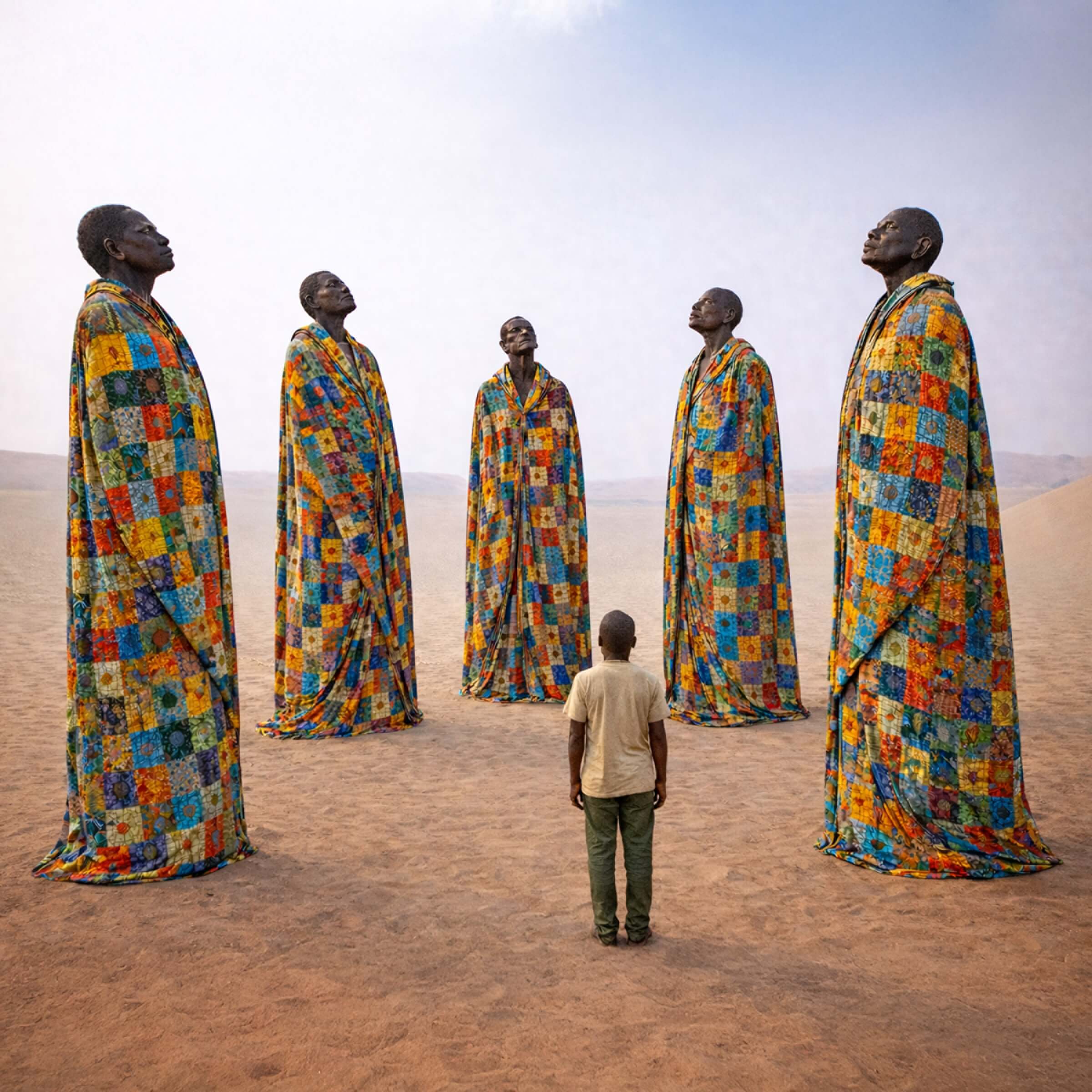 - The Inner Glow: A halo of light emanates from the collar of each quilt, illuminating the ancestors' faces from below. This light suggests a spiritual presence—an internal life force glowing from within the metal.